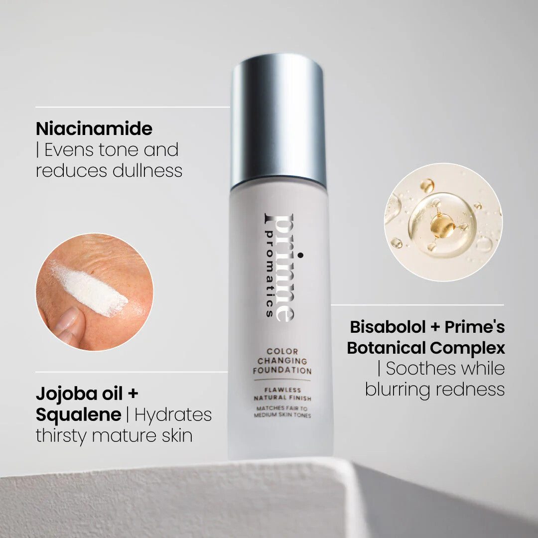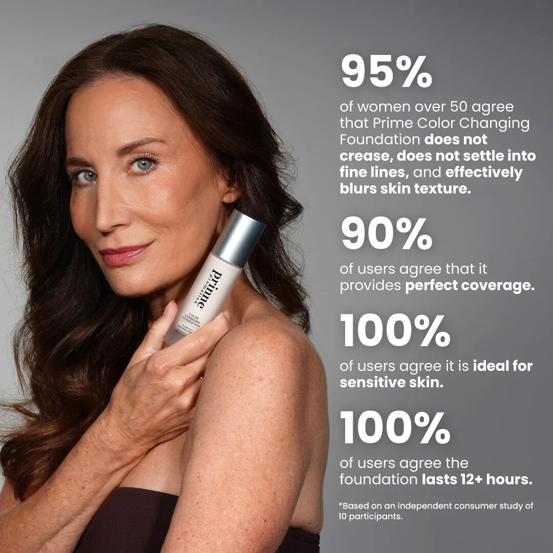 Don’t think of the Prime Color Changing Foundation as a ‘novelty’. It’s not. This is a foundation developed from the ground-up for women over 50. It offers the light to medium coverage you need to blur pores, erase blemishes, even out discoloration, and reduce redness.